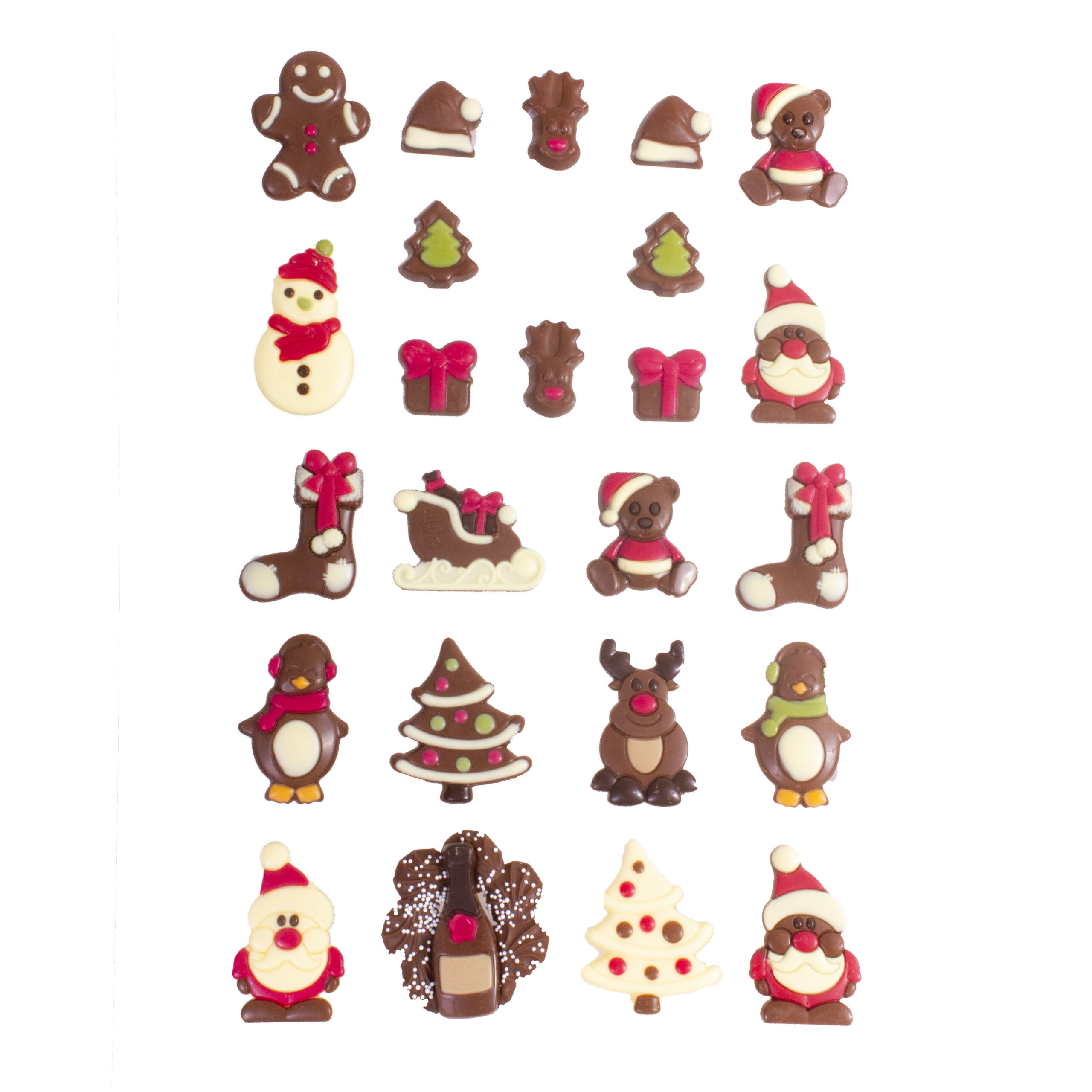 12 st. adventskalendrar med 24 st. blandade figurer av dekorerad mjölkchoklad och vit choklad. Beställ i god tid då lagret är begränsat.